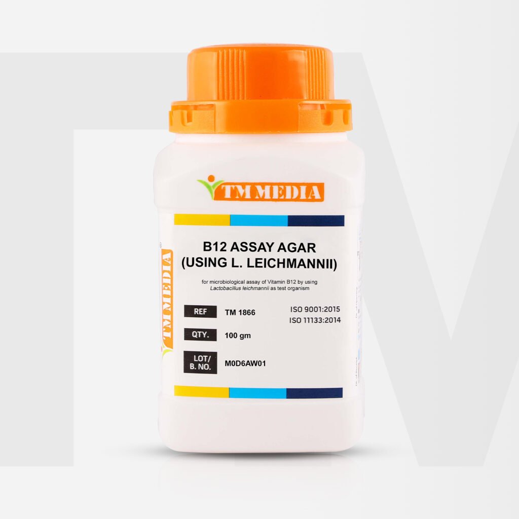 Vitamin B12 Assay Medium is a defined microbiological medium used for the quantitative determination of Vitamin B12 by Lactobacillus leichmannii (ATCC 7830) as the indicator organism. This is a Vitamin B12-deficient medium, but it has all the other nutrients and vitamins required for the test bacterium to grow.